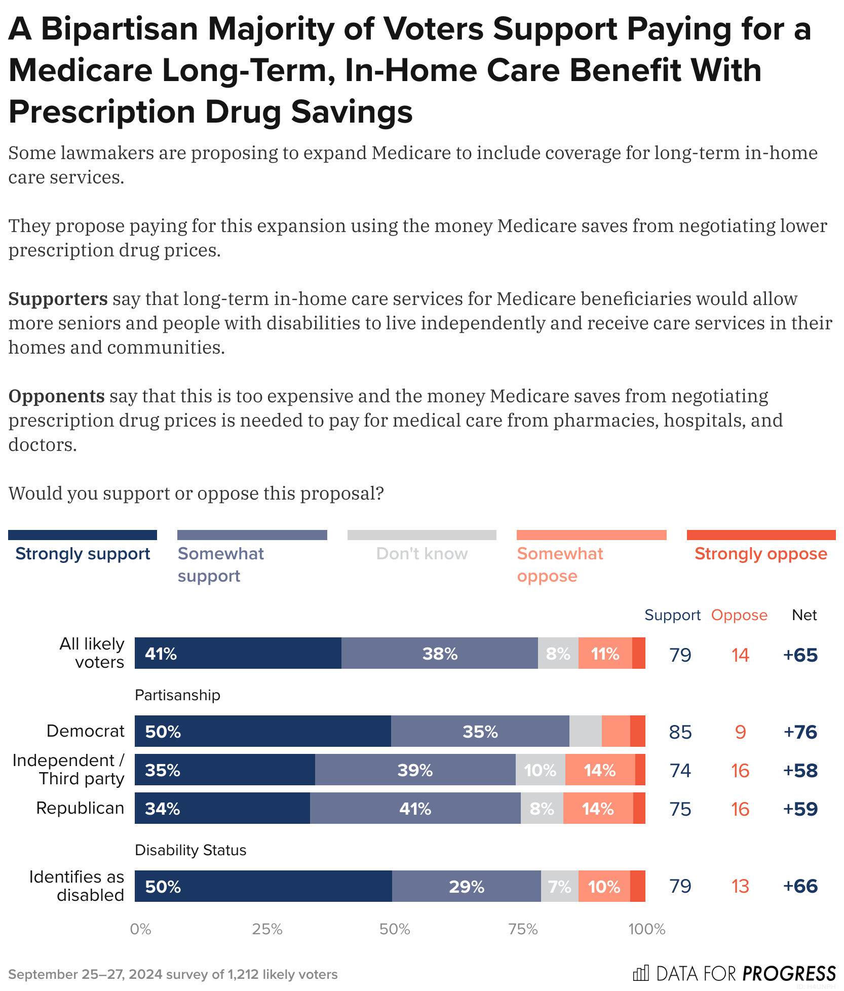 Today, Vice President Kamala Harris announced her support for expanding Medicare to include coverage for long-term, in-home care services for disabled Americans — a policy proposal that a new Data For Progress survey finds is strongly supported by a bipartisan majority of likely voters.