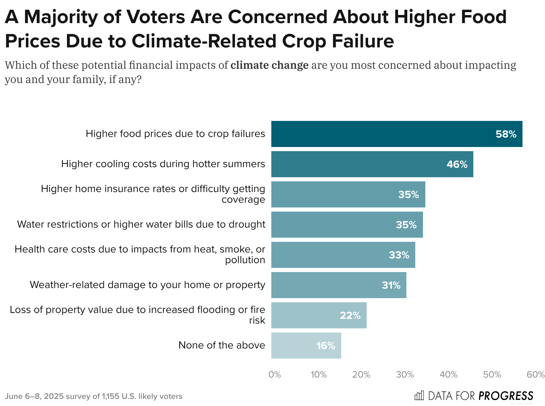 When it comes to the potential financial impacts of climate change, voters are especially worried about rising food costs from climate-related crop failure: 58% of respondents say this is a top concern for them. Other significant concerns include higher cooling costs during hotter summers (46%), higher home insurance rates or difficulty getting coverage (35%), and water restrictions or higher water bills due to drought (35%). Only 16% of respondents say they are unconcerned about the potential financial impacts of climate change.