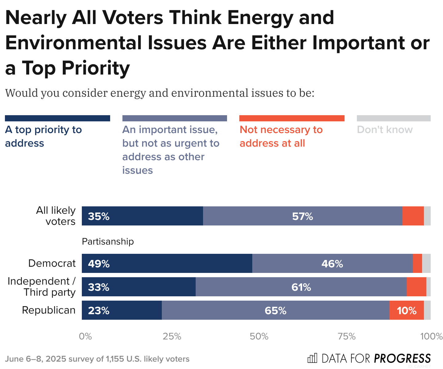 Voters nearly universally believe that energy and environmental issues are important to address. This holds across party lines: 95% of Democrats, 94% of Independents, and 88% of Republicans indicate that energy and environmental issues are either important or a top priority to them. However, the degree of importance varies significantly with party affiliation. Nearly half (49%) of Democrats say energy and environmental issues are a top priority, while only a third (33%) of Independents and just under a quarter (23%) of Republicans feel the same.