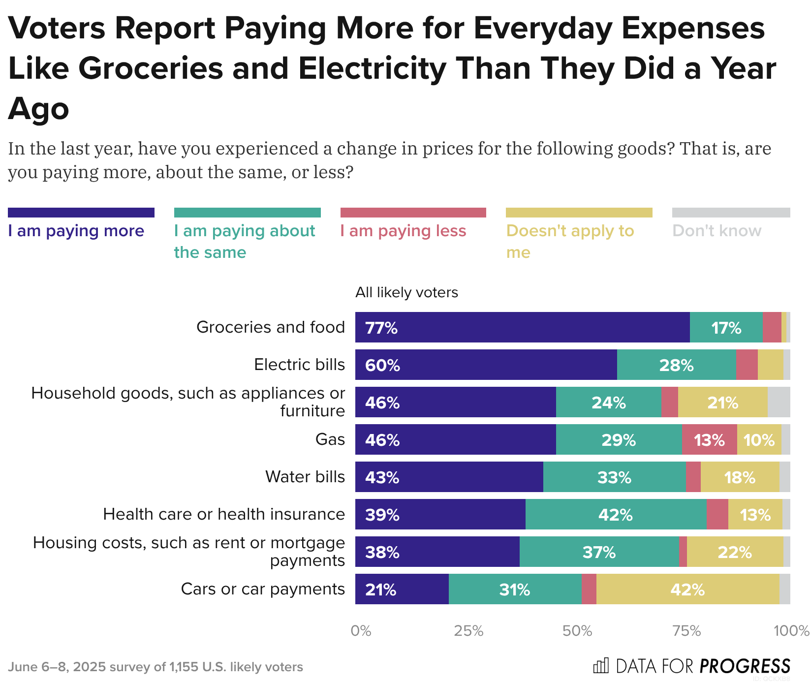 New polling from Data for Progress shows that a majority of voters report that they are paying more for groceries (77%) and electric bills (60%) compared with last year. The change in food costs is particularly pronounced among older voters: 82% of voters over the age of 45 report rising grocery costs, compared with 68% of voters under 45.