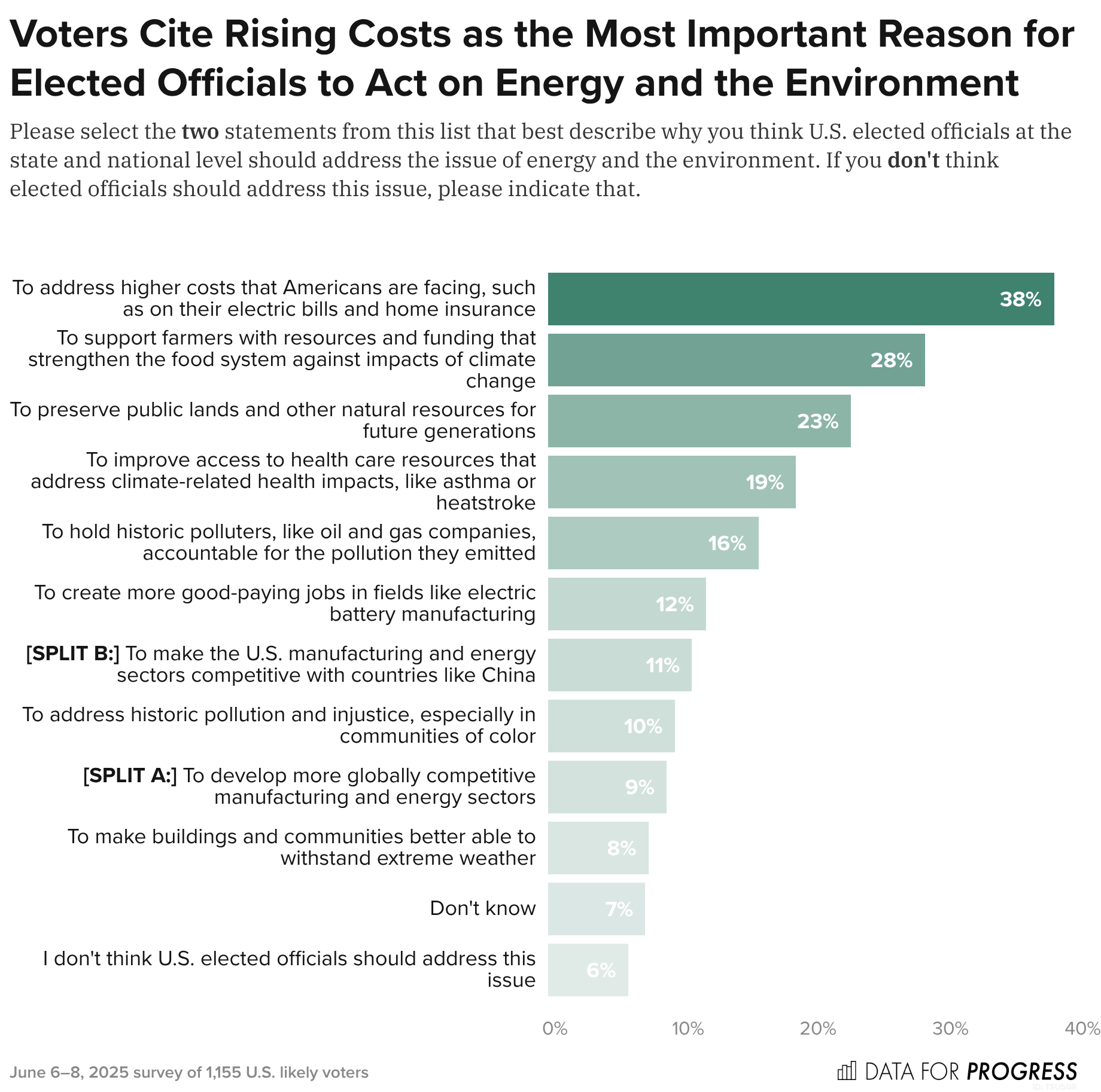 Next, voters were asked to choose the two most important reasons for U.S. elected officials to address the issue of energy and the environment. Around 2 in 5 voters (38%) rank rising costs, such as higher electric bills and home insurance, as the most important reason to address these issues. Other top reasons voters cite include supporting farmers in creating climate-resilient food systems (28%), preserving public lands and other natural resources for future generations (23%), and improving access to health care resources that address climate-related health impacts (19%). Only 6% of voters don’t think the federal government should address energy and environmental issues.