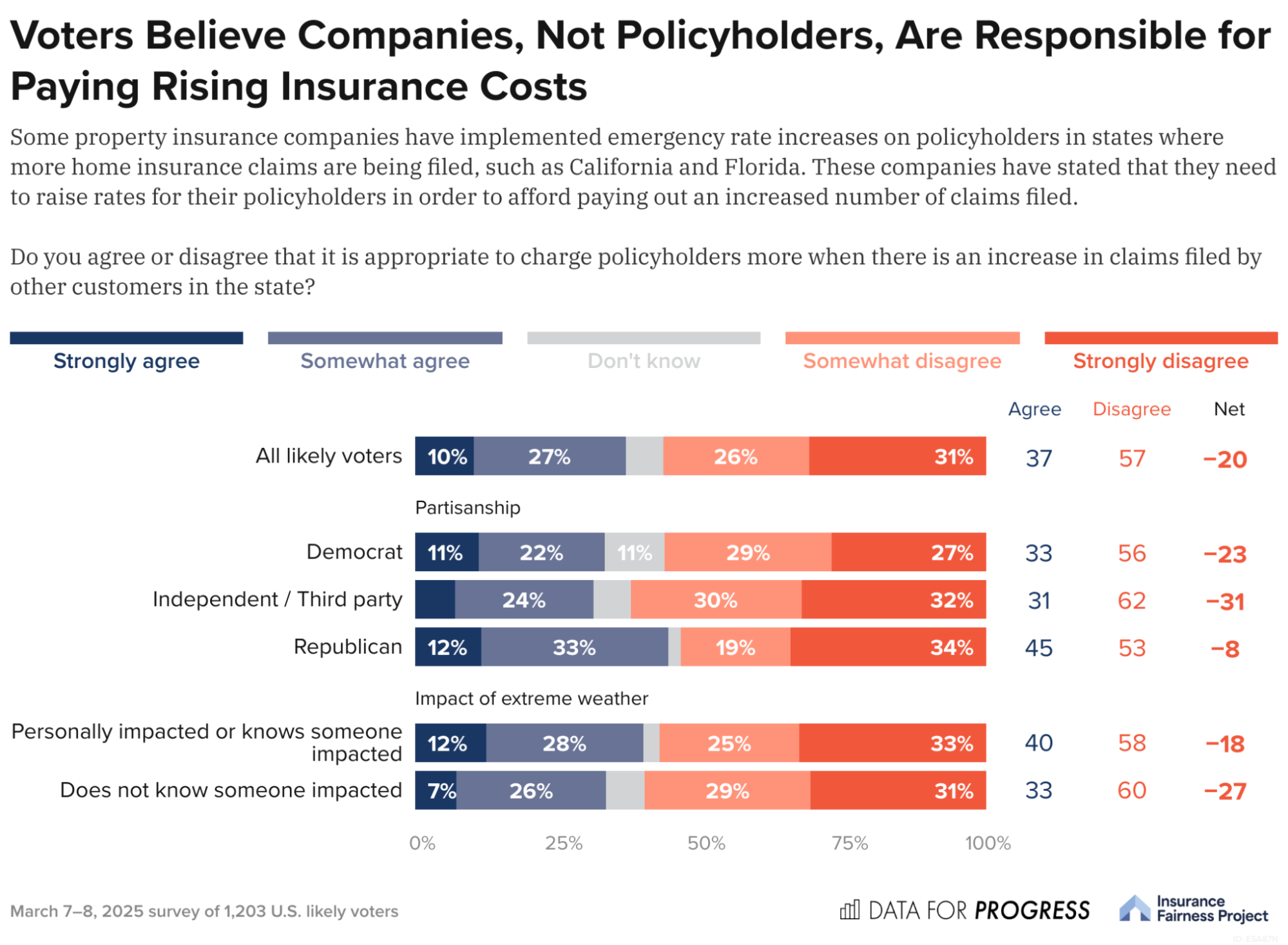 Building on past national research, Data for Progress and the Insurance Fairness Project surveyed 1,203 likely voters to understand their awareness and views of the national insurance crisis, as well as their attitudes about how to resolve current challenges in the industry, like home insurance rates rising and providers exiting some state insurance markets.