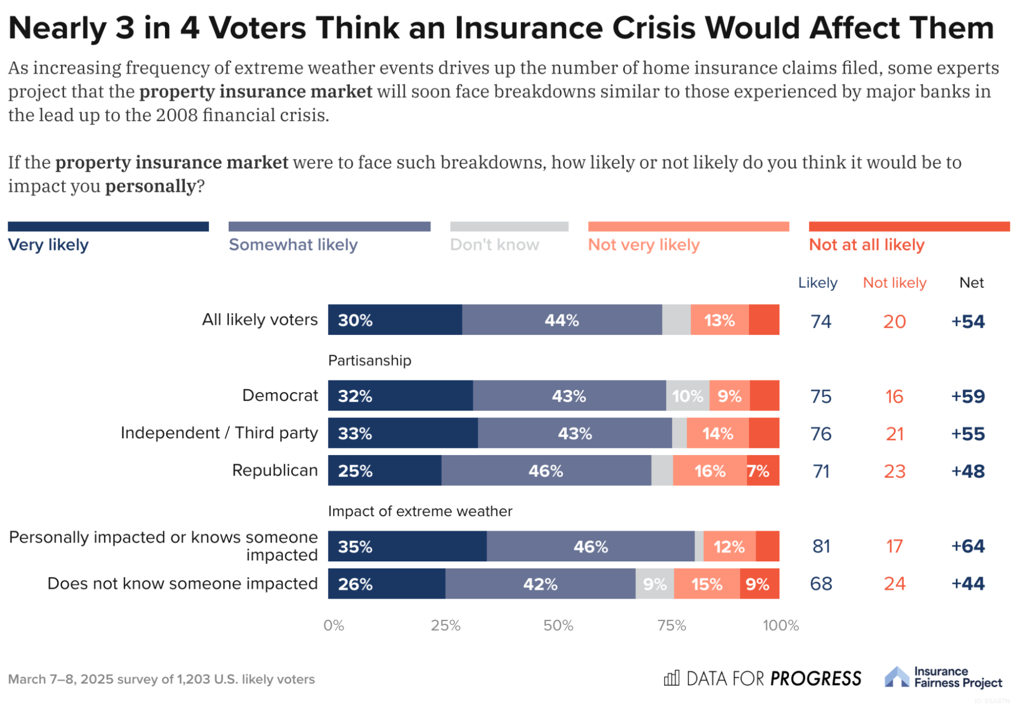 Relatedly, these voters know that the states at higher risk of extreme weather aren’t the only ones likely to be harmed by a property insurance crisis. In fact, nearly three-quarters of respondents (74%) say that it is “very likely” or “somewhat likely” that a breakdown in the property insurance market would affect them personally. Once again, these results remain consistent across party lines and regardless of whether voters have been personally impacted by extreme weather events in the past, with 68% of * unaffected * respondents believing that the crisis is likely to impact them.