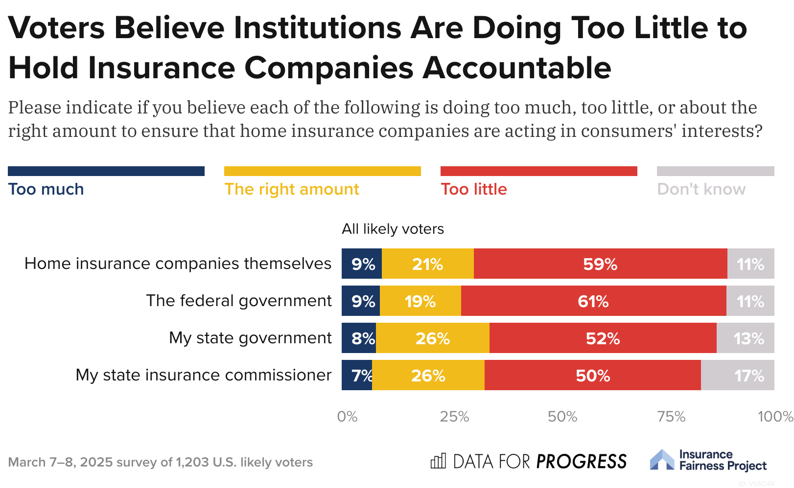This polling reflects that while voters nationwide are aware and concerned about the growing challenges that the property insurance industry faces, they feel that the institutions that could offer solutions to this crisis aren’t going far enough to ensure home insurance companies are acting in consumers’ interests. If the insurance industry faces a major financial breakdown, voters think it is likely that they will be responsible for bearing the costs. Amid increasing risks of extreme weather, voters support the government taking more action to protect their property and paychecks.