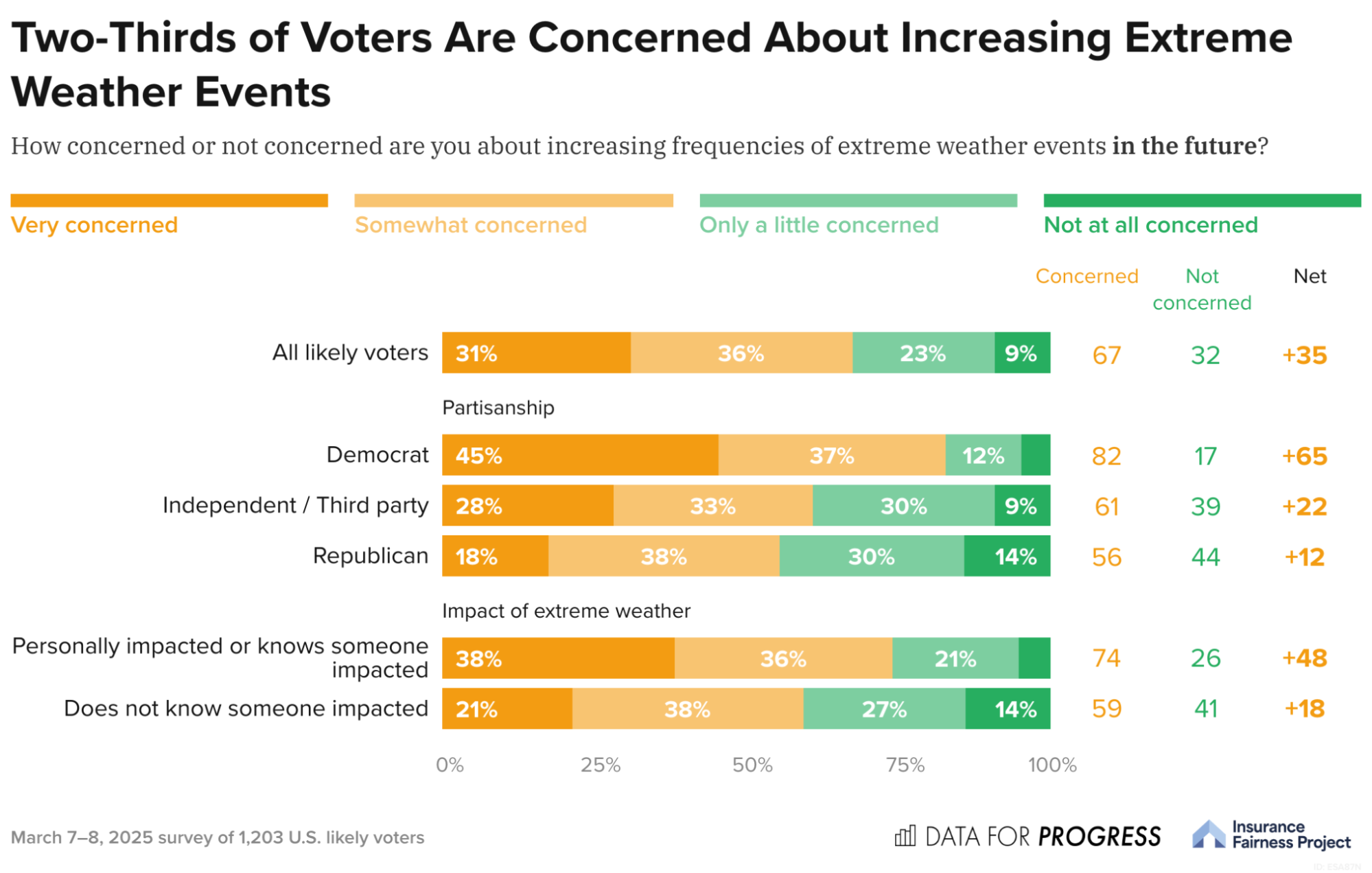 Two-thirds of voters (67%) say that they are somewhat or very concerned about the increasing frequency of extreme weather events in the future. This includes 74% of voters who have either been personally impacted by extreme weather in the past or who know someone else who has been directly affected.