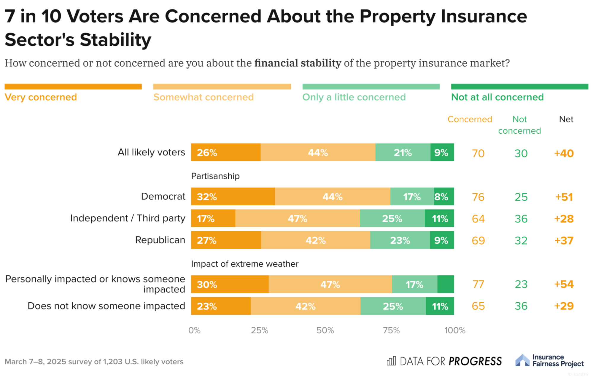 In line with their awareness of changes in the property insurance sector and concerns about the increasing frequency of extreme weather events, voters also report heightened concerns about the stability of the property insurance market overall. Seventy percent of all likely voters report being “somewhat concerned” or “very concerned” about the market’s financial stability. Not only is this true across party lines, but also, voters are concerned regardless of their personal level of experience with extreme weather events, with 77% of those who know someone impacted and 65% of those who do not saying they are concerned.