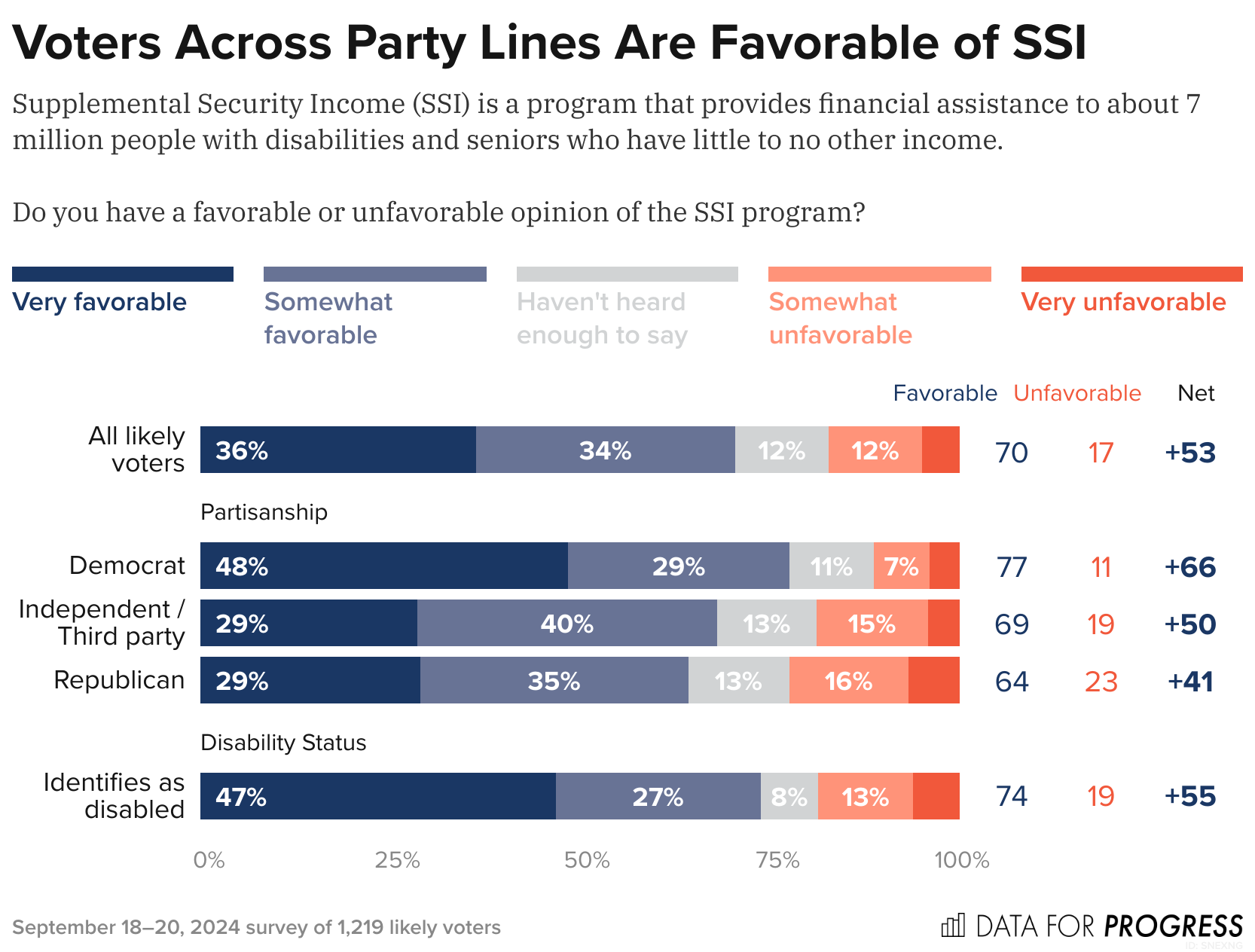 After reading this description, 70% of voters — including 77% of Democrats, 69% of Independents, 64% of Republicans, and 74% of disabled voters — have a favorable view of SSI.