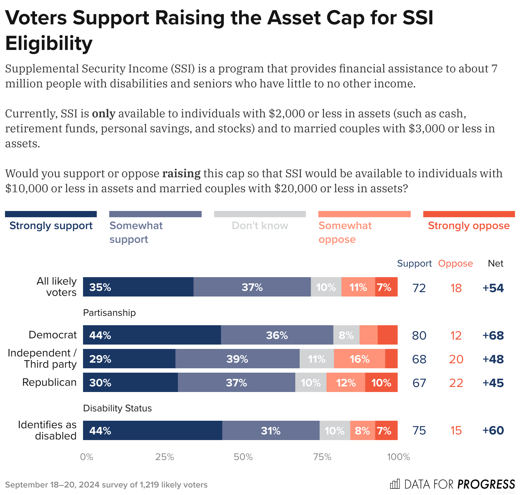 The survey finds an overwhelming majority of voters (72%), including 80% of Democrats, 68% of Independents, 67% of Republicans, and 75% of disabled voters, support raising this asset cap to $10,000 for individuals and $20,000 for married couples.