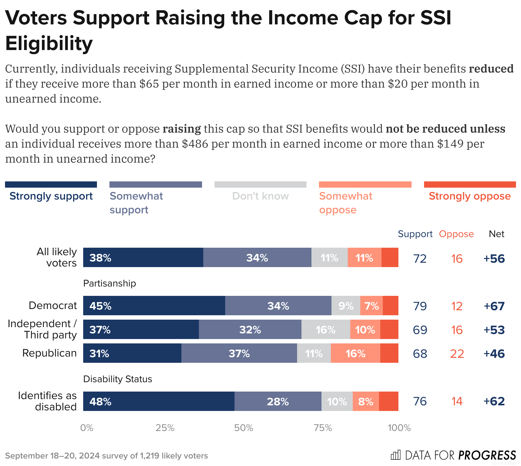 More than 7 in 10 voters support raising this income cap so that SSI benefits would not be reduced unless an individual receives more than $486 per month in earned income or more than $149 per month in unearned income.